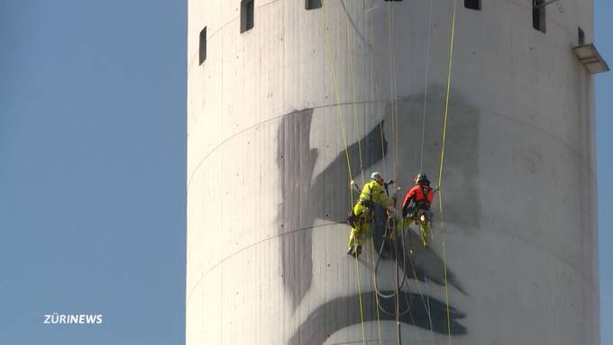 Letzten Oktober sprayte das Kollektiv «KCBR» in einer waghalsigen Aktion zwölf grosse Buchstaben auf dem bekannten Hochkamin in Zürich West. Nun hängt auch das Putz-Team in schwindelerregender Höhe, um den Schriftzug von der Kehrrichtverbrennungsanlage wieder zu entfernen.
