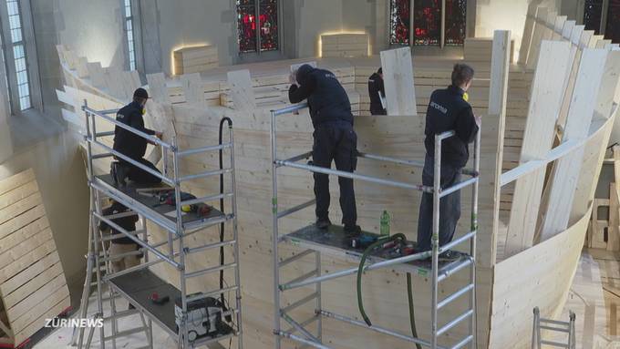 In der Wasserkirche steht ein Teil eines riesengrossen Holzschiffs. Das aufwändige Kunstprojekt, das an die biblische Arche Noah angelehnt ist, steht für Hoffnung, Aufbruch und Gemeinschaft. Es dient aber auch als Bühne für verschiedene Anlässe.